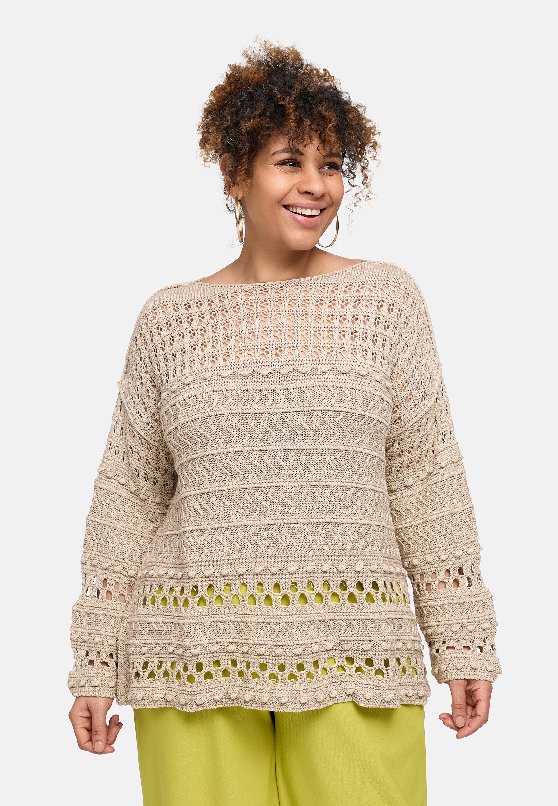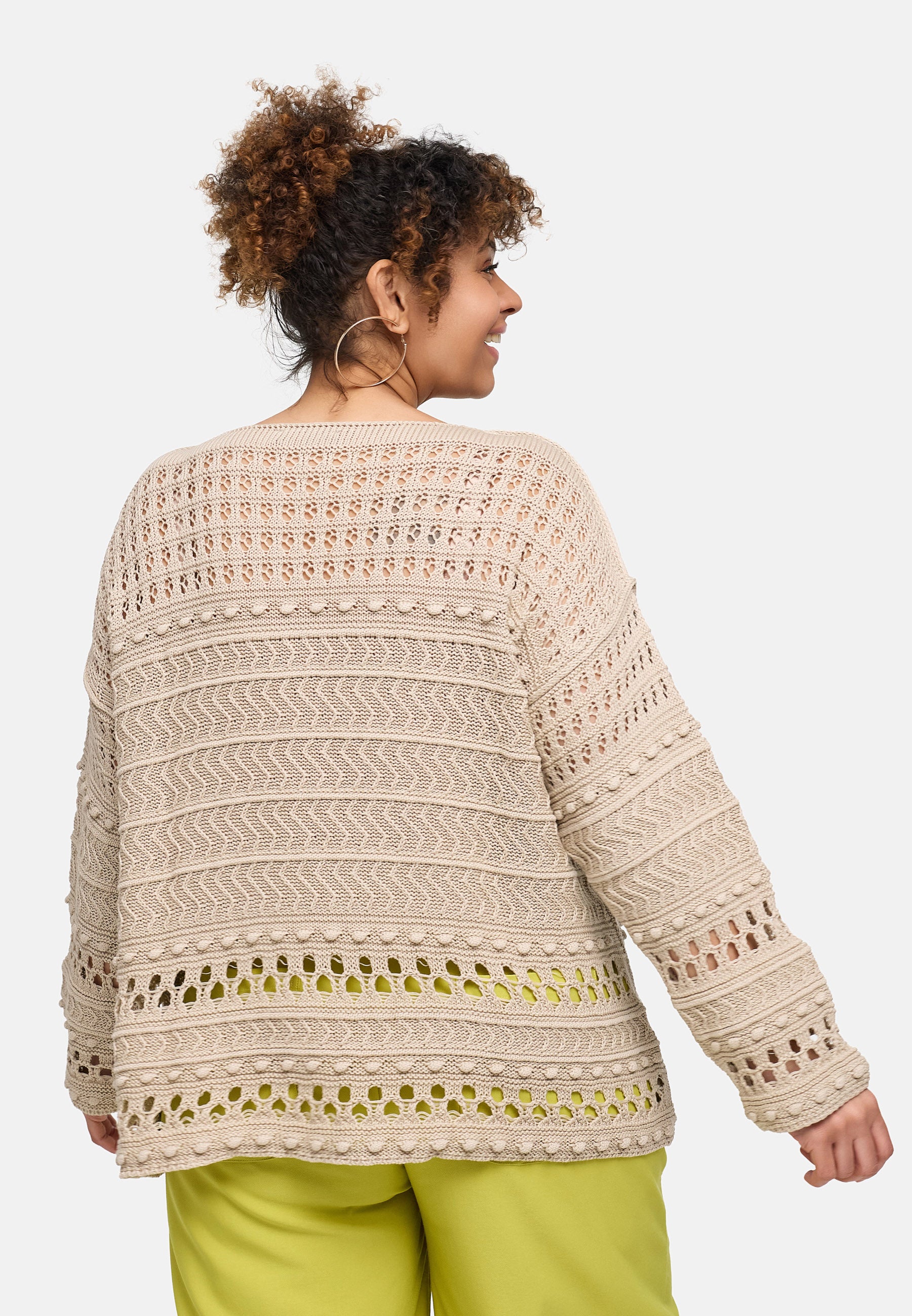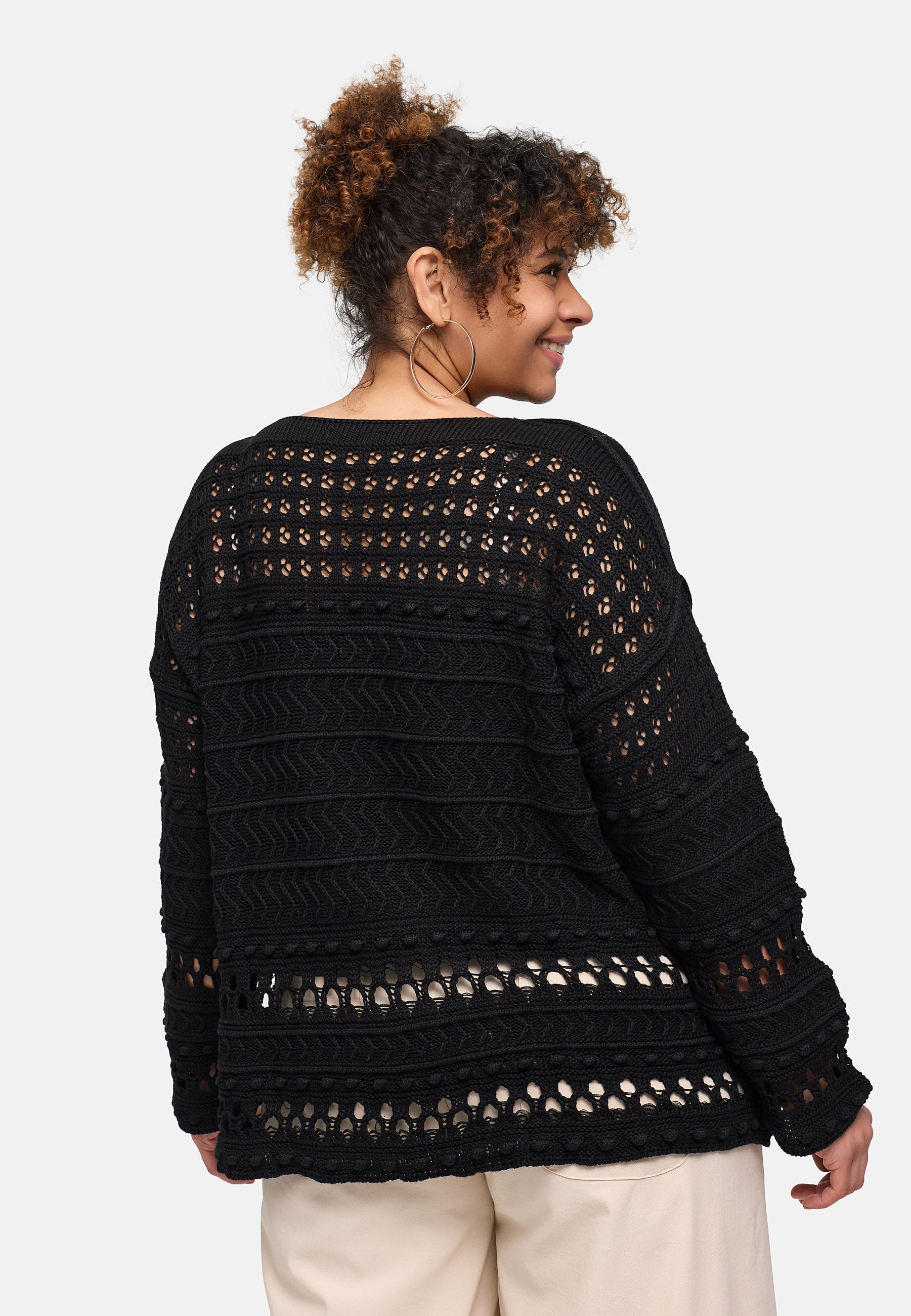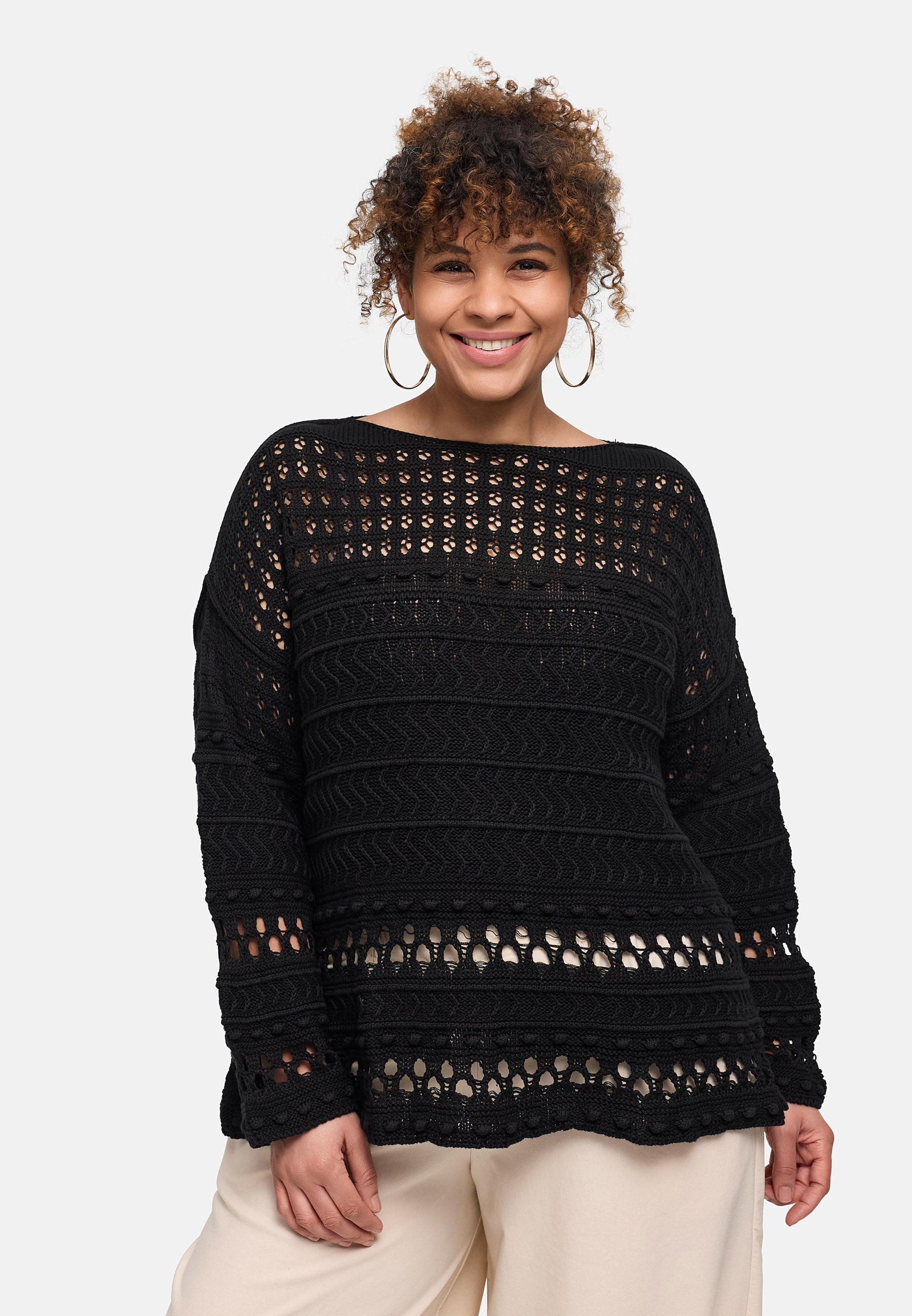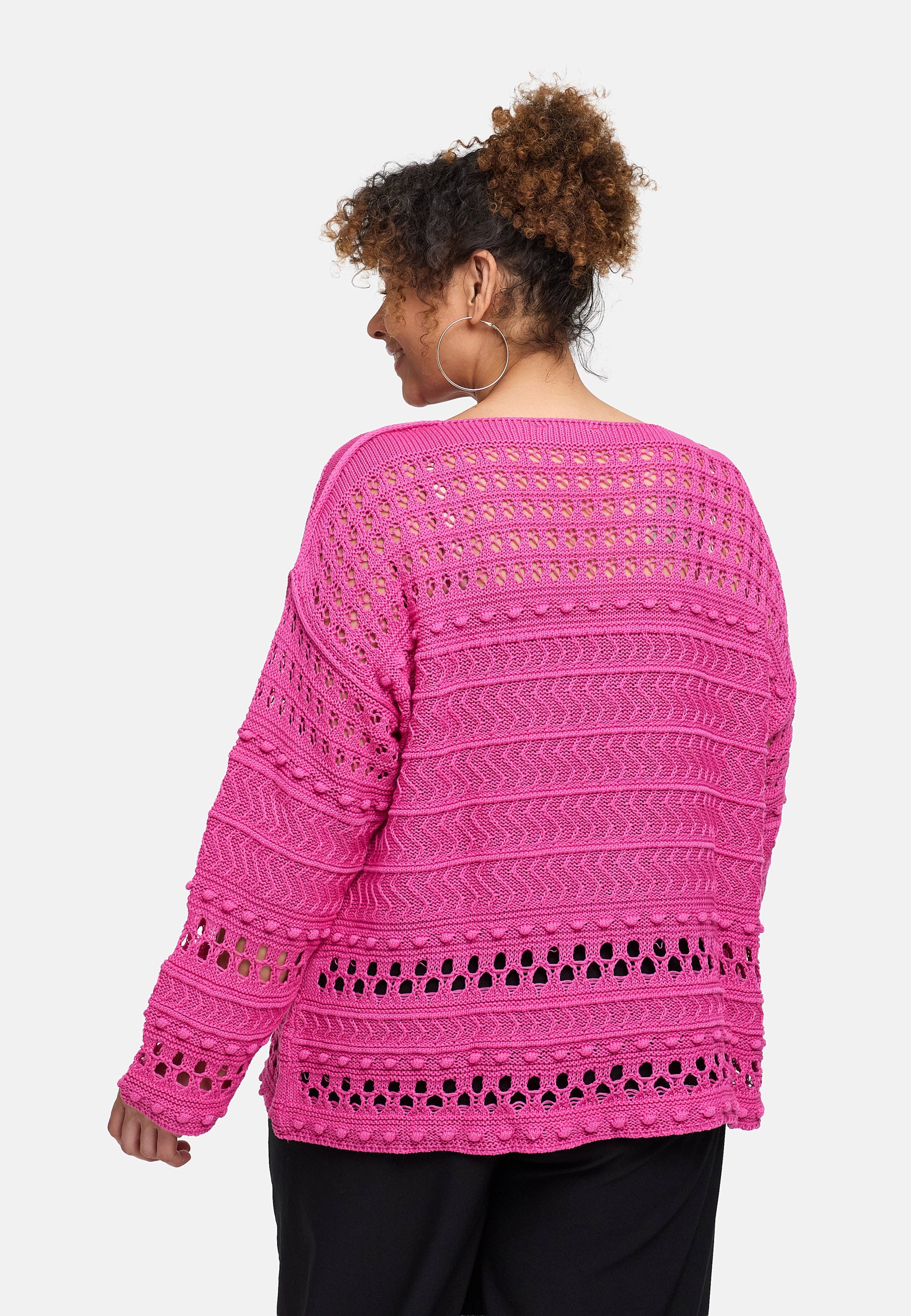Der feine Baumwollstrick kombiniert grafische Ajourreihen mit sanften Zopfstrukturen und erzeugt einen spannenden, aber ruhigen Look. Dank des entspannten Schnitts fällt das Shirt locker über Hüfte und Bauch, ohne an Volumen zuzulegen. Schwarz wirkt clean und citytauglich, Beige natürlich und soft, Pink sorgt für ein frisches Statement. Durch die leichte Transparenz eignet es sich ideal zum Layern.