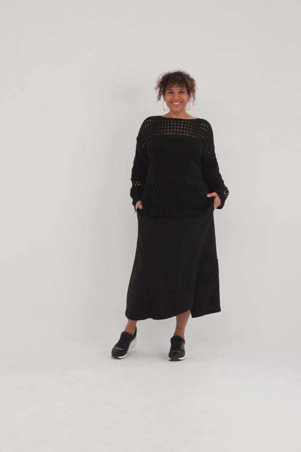 • Mit Midirock und Boots entsteht ein femininer Kontrast zum luftigen Strick.