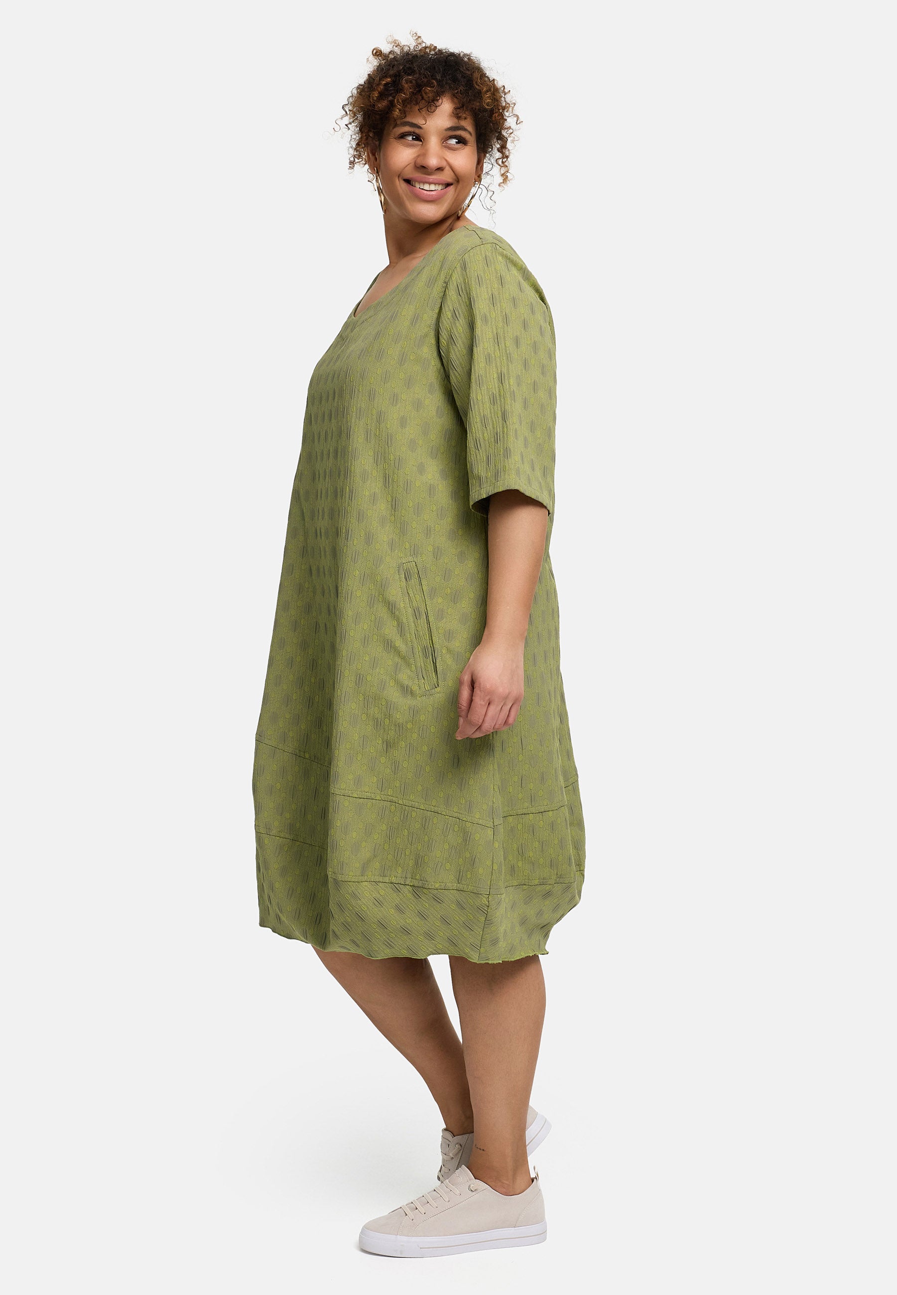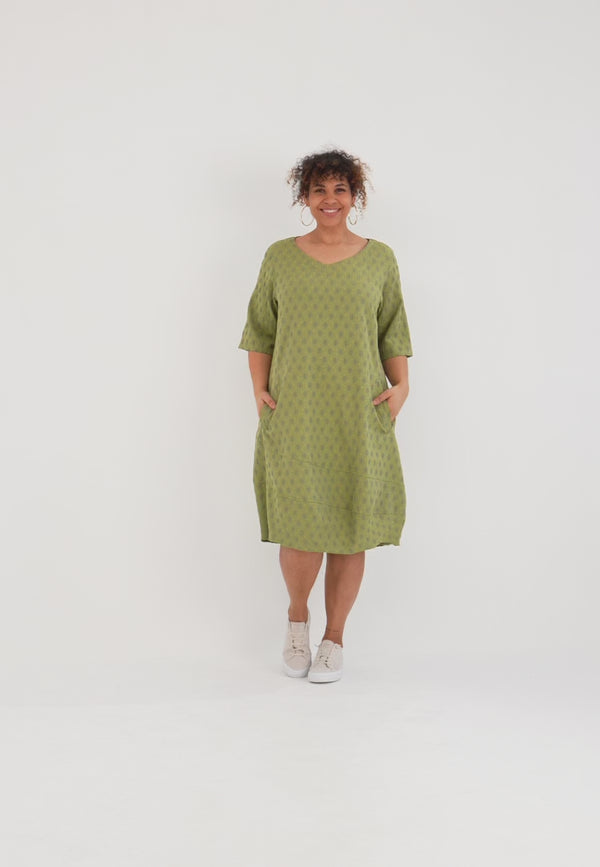 „Olina“ ist dein unkomplizierter Alltagsheld. Der fein strukturierte Jacquard bringt Tiefe und macht das Kleid besonders – ohne laut zu sein. Der sanfte V-Ausschnitt rahmt das Dekolleté, Halbärmel geben angenehm Lichtschutz, und die entspannte Silhouette fällt locker, ohne aufzutragen. Die breite Saumpartie mit geschwungenen Nähten setzt einen modernen Akzent und verleiht dem Look dezent Volumen.